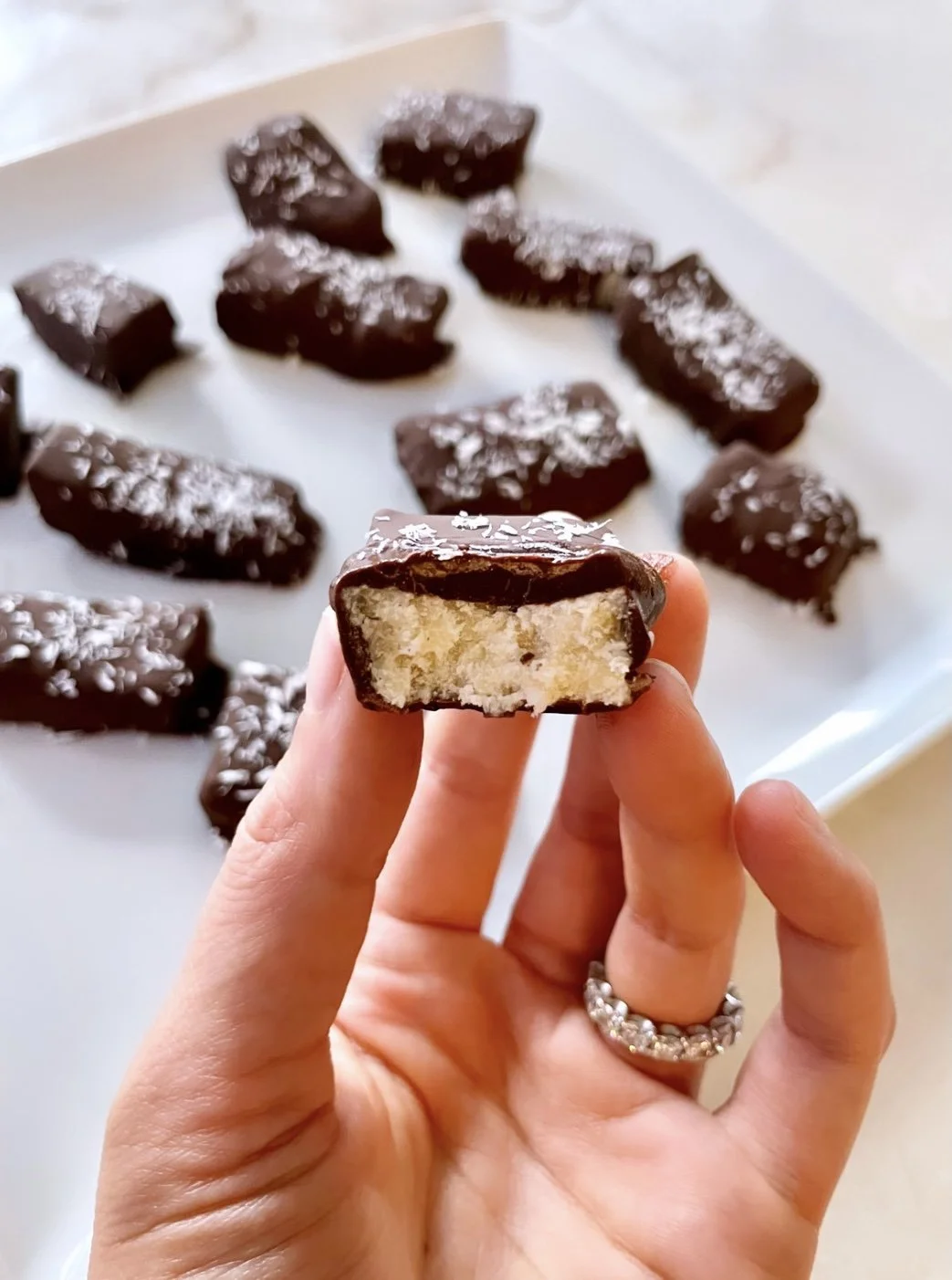 First mix melted coconut butter, shredded coconut, maple syrup, vanilla and pinch of salt together. Then you can either form into small nuggets and place on a parchment lined sheet tray or press mixture into a loaf pan lined with parchment paper. Put in the freezer to harden (typically takes around an hour!). If you froze the coconut mixture in a baking dish, remove and cut into small rectangles. Then dip the coconut bars into the melted chocolate! I like to use two forks for this and drag the bottom of the candy against the lip of the bowl to remove the excess chocolate. You can also sprinkle a little shredded coconut on top if you’d like! Then place on a parchment lined plate or sheet tray and put back in freezer to enjoy when read